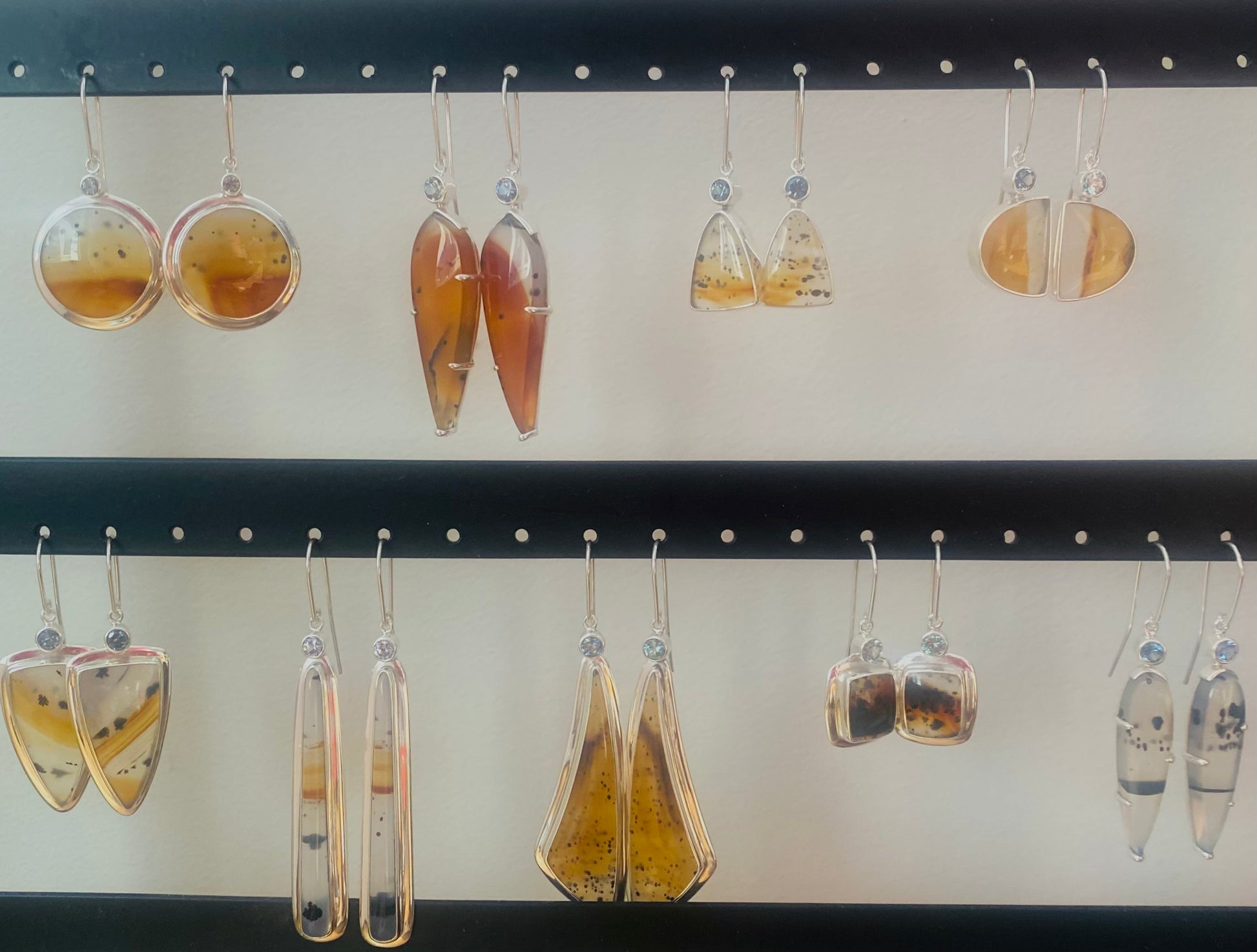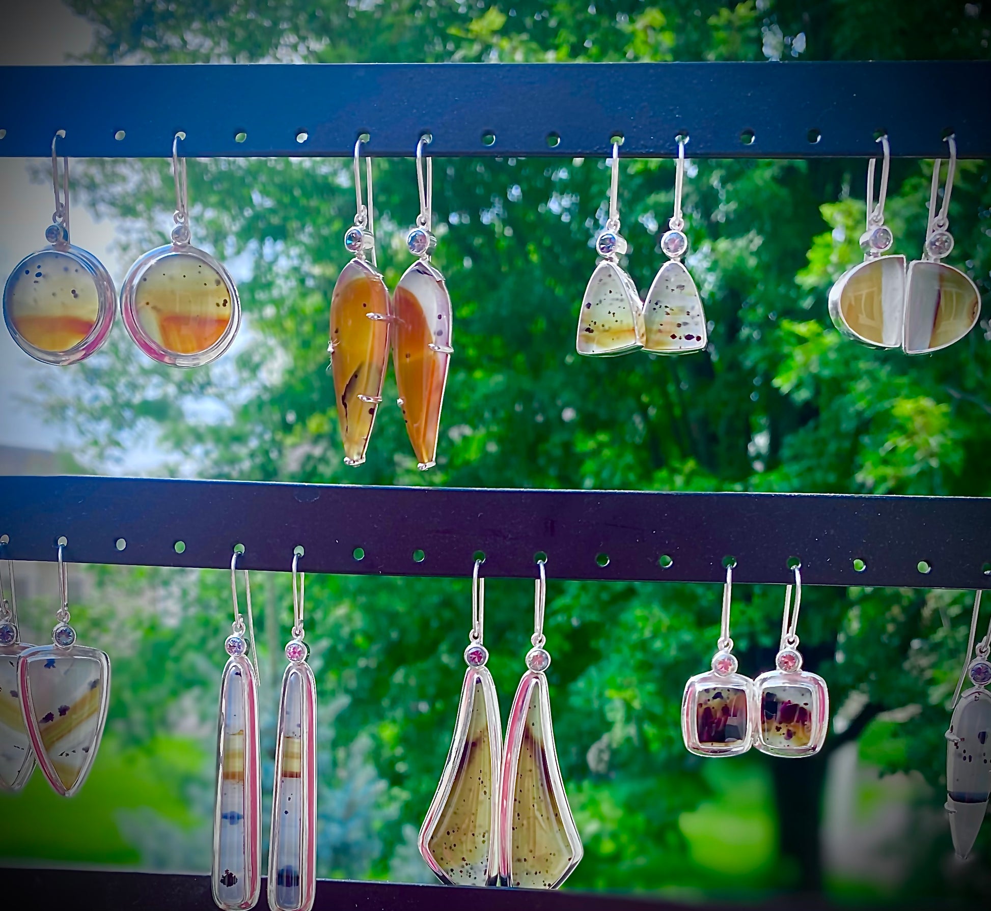 Discover the natural elegance of Montana Drift Gems—a handcrafted earring collection pairing banded Montana Agateswith brilliant Montana Sapphires, all set in sterling silver. Each pair is one-of-a-kind, showcasing the unique color patterns and textures formed by nature over millions of years. These designs reflect the rugged beauty of the West with a refined, modern sensibility. From sculptural drops to sleek geometrics, every piece carries the story of stone, sky, and river. Perfect for collectors and those who love meaningful, artisan-made jewelry.